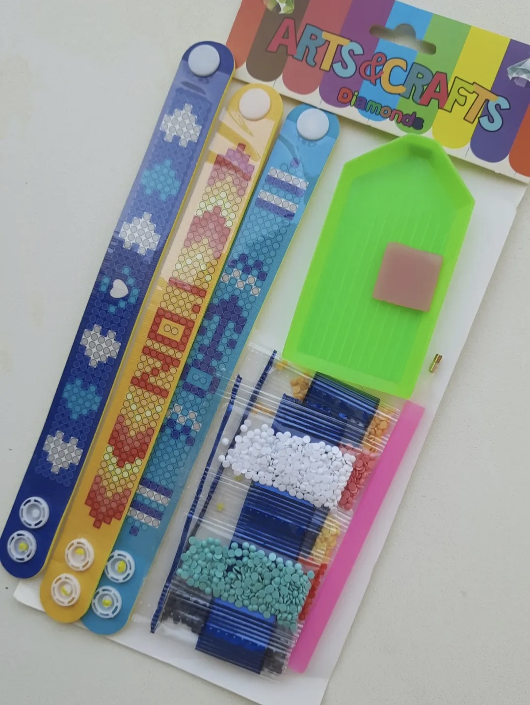 داخل هر پک ۳عدد دستبند با تمام ابزار و لوازم موردنیاز چسب، قلم و الماس ها و ظرف الماس میباشد
