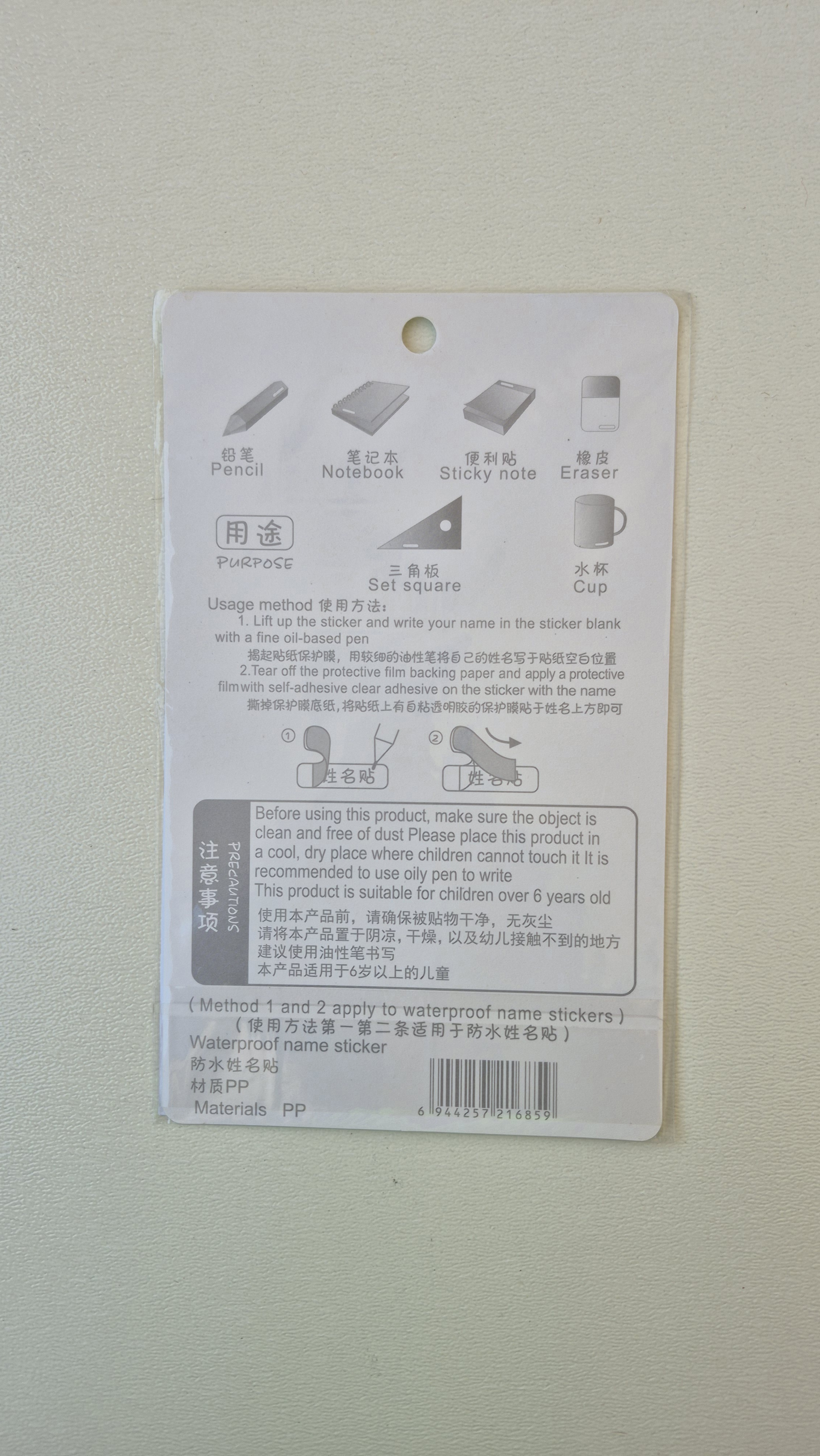 برچسب اسم ضداب برای دفتر و کتاب و قمقمه و ظرف غذا و ظرف حبوبات و ادویه بسیار کاربردی است به دلیل داشته یه لایه ضدآب روی برچسب باعث میشود دیرتر خراب شود و اسم نوشته شده پاک نشود.